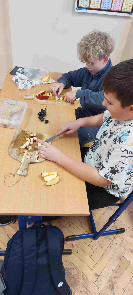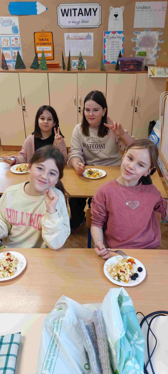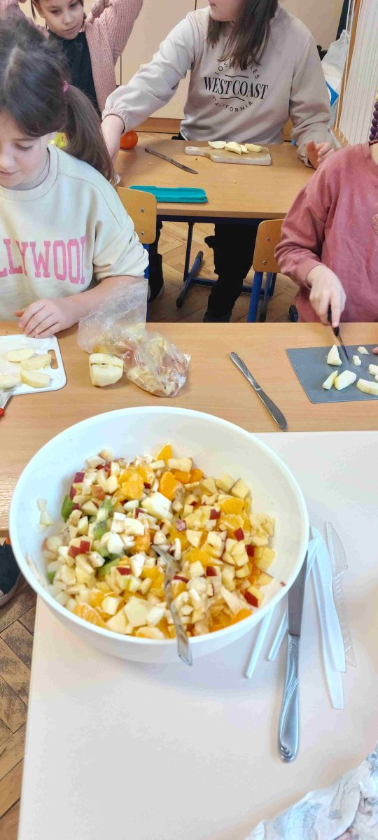 Oprócz przyswajania wiadomości na temat zdrowego odżywiania, uczniowie klasy czwartej przeszli od słowa do czynu wykonując samodzielnie pyszną, zdrową i kolorową sałatkę owocową. Polecamy! Była pyszna! 😊