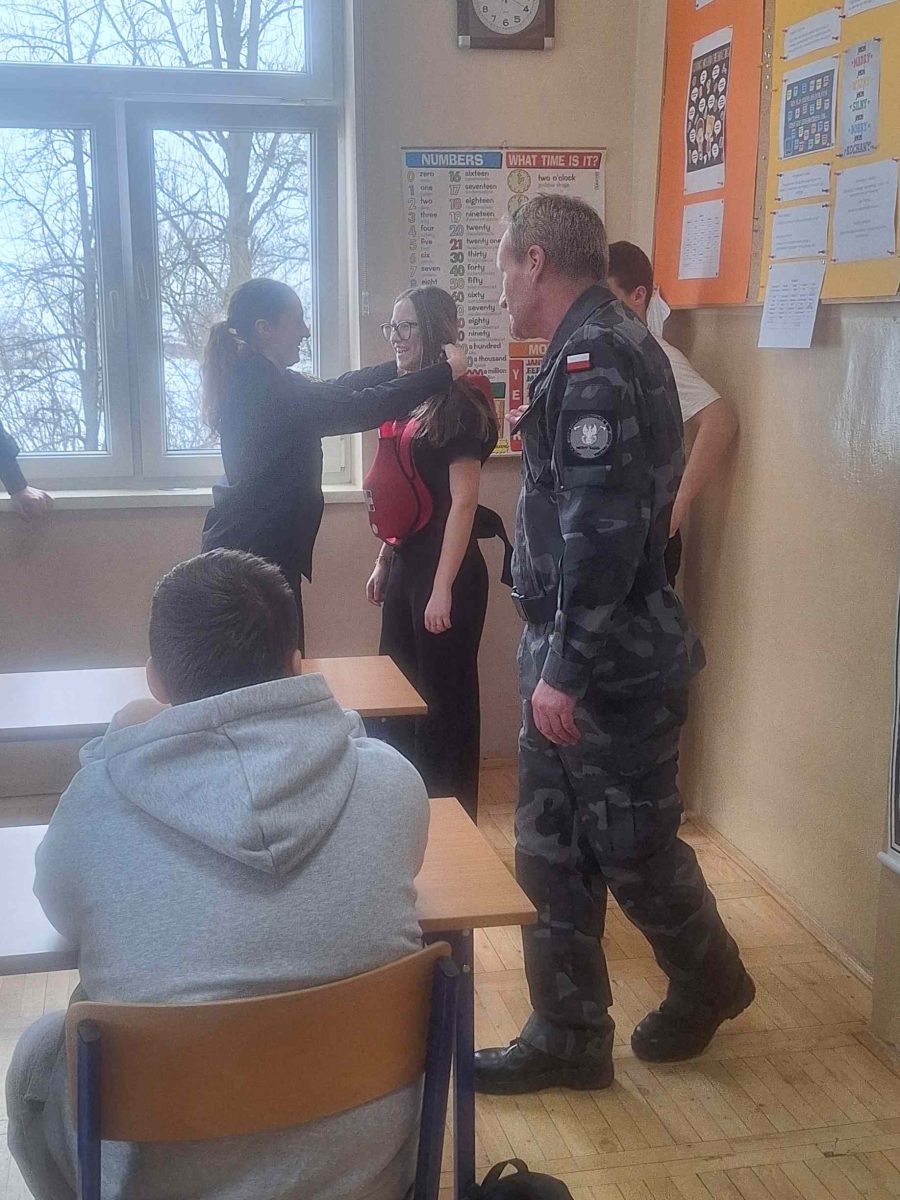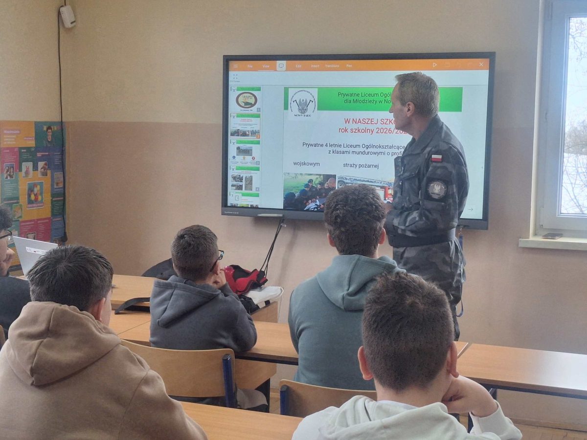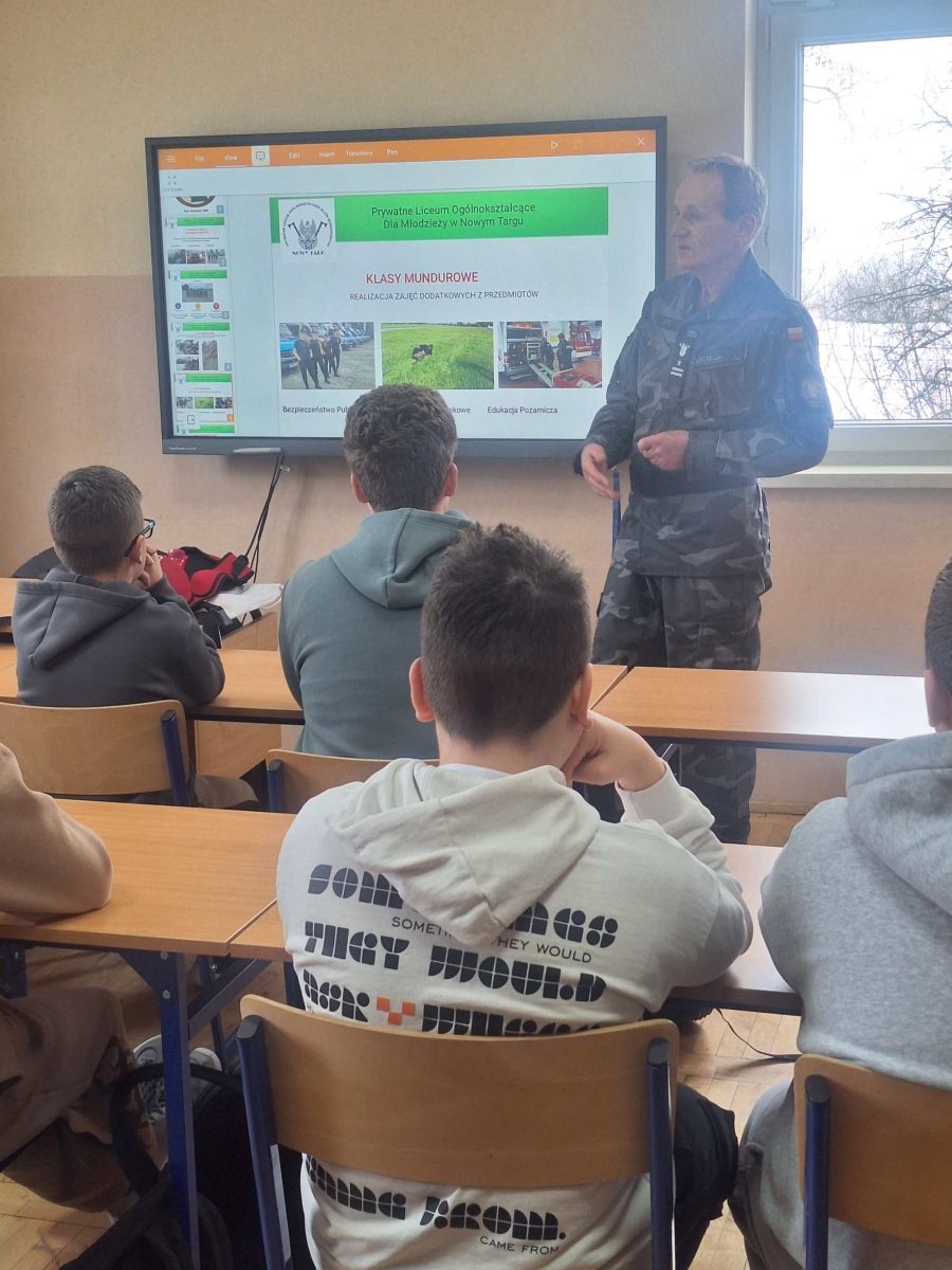 Na początku marca do naszej szkoły zawitali przedstawiciele Prywatnego Liceum Ogólnokształcącego dla Młodzieży im. gen. Józefa Hallera w Nowym Targu. Ta szkoła potocznie jest nazywana „mundurówką”. Dzięki tej wizycie nasi uczniowie mogli się dowiedzieć, do jakich zawodów przygotowuje ta szkoła tj. m, in. policjant i żołnierz. Ponadto mogli wziąć udział w praktycznych ćwiczeniach ratowania człowieka, który się zadławił.