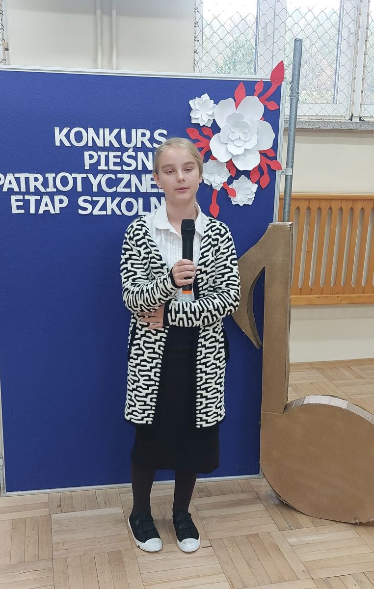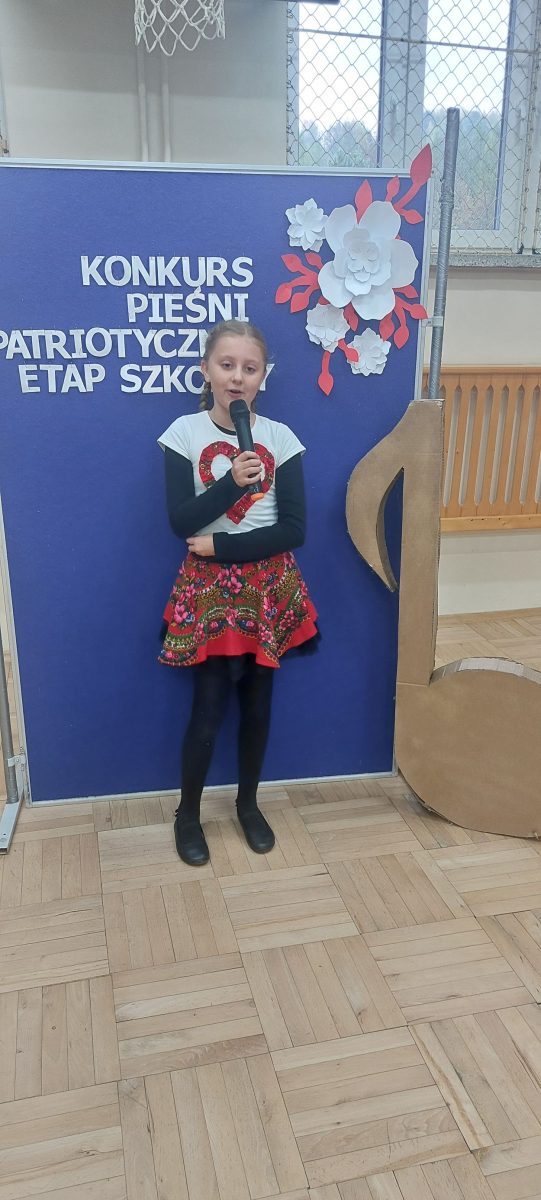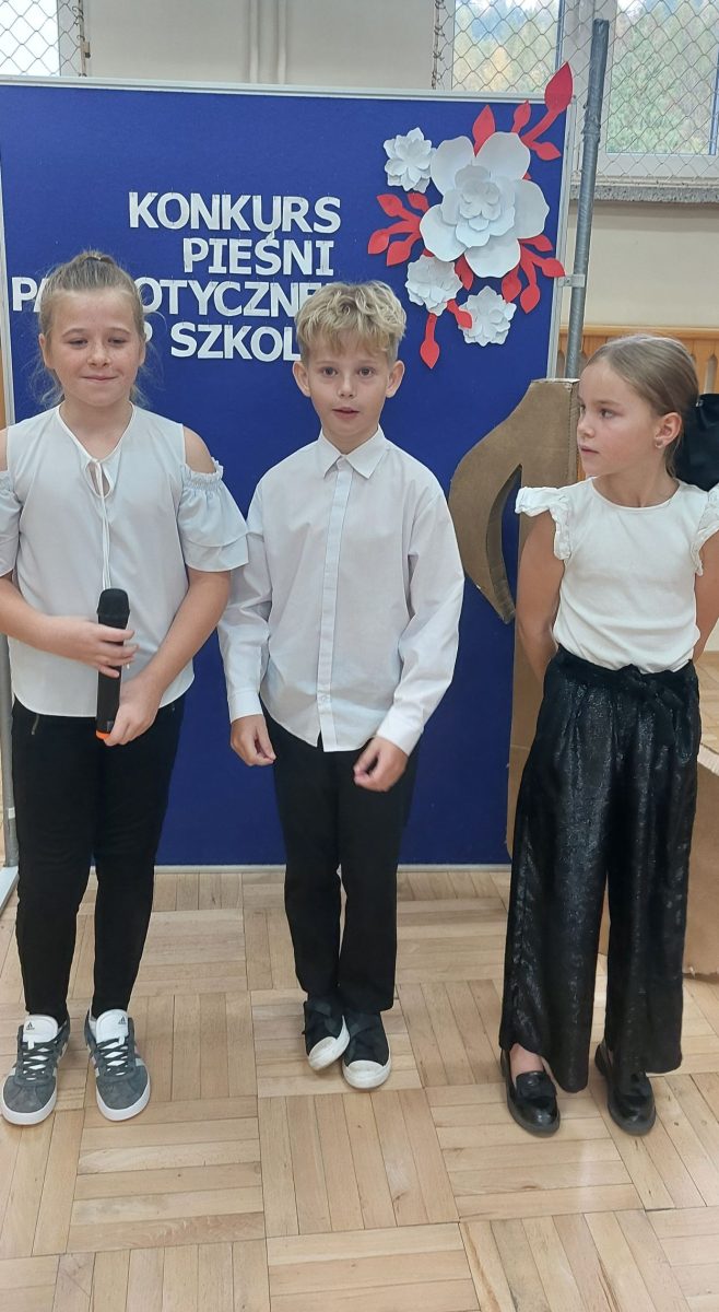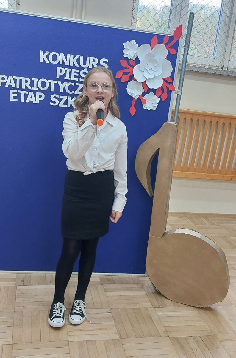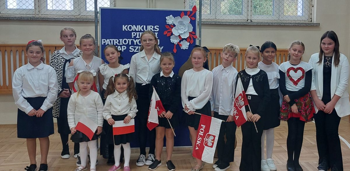 Dnia 22.10.2025 r. w naszej szkole odbyły się eliminacje do X Gminnego Konkursu Pieśni Patriotycznych. Celami konkursu jest: popularyzowanie tradycji śpiewania pieśni patriotycznej wśród dzieci i młodzieży, ze wszystkimi aspektami edukacyjnymi i wychowawczymi; zainteresowanie dziedzictwem kulturowym, pieśnią, tradycją i obyczajami; uświadomienie i zrozumienie roli wartości narodowo-patriotycznych w życiu człowieka; podnoszenie poziomu artystycznego. Do konkursu przystąpiło 7 solistów i 3 zespoły wokalne. Uczestnicy zaprezentowali w konkursie utwór o charakterze patriotycznym. Jury oceniało: dobór repertuaru, poziom techniczny wykonywanego utworu,  interpretacja utworu, ogólny wyraz artystyczny. Uczniowie zaprezentowali wysoki poziom.