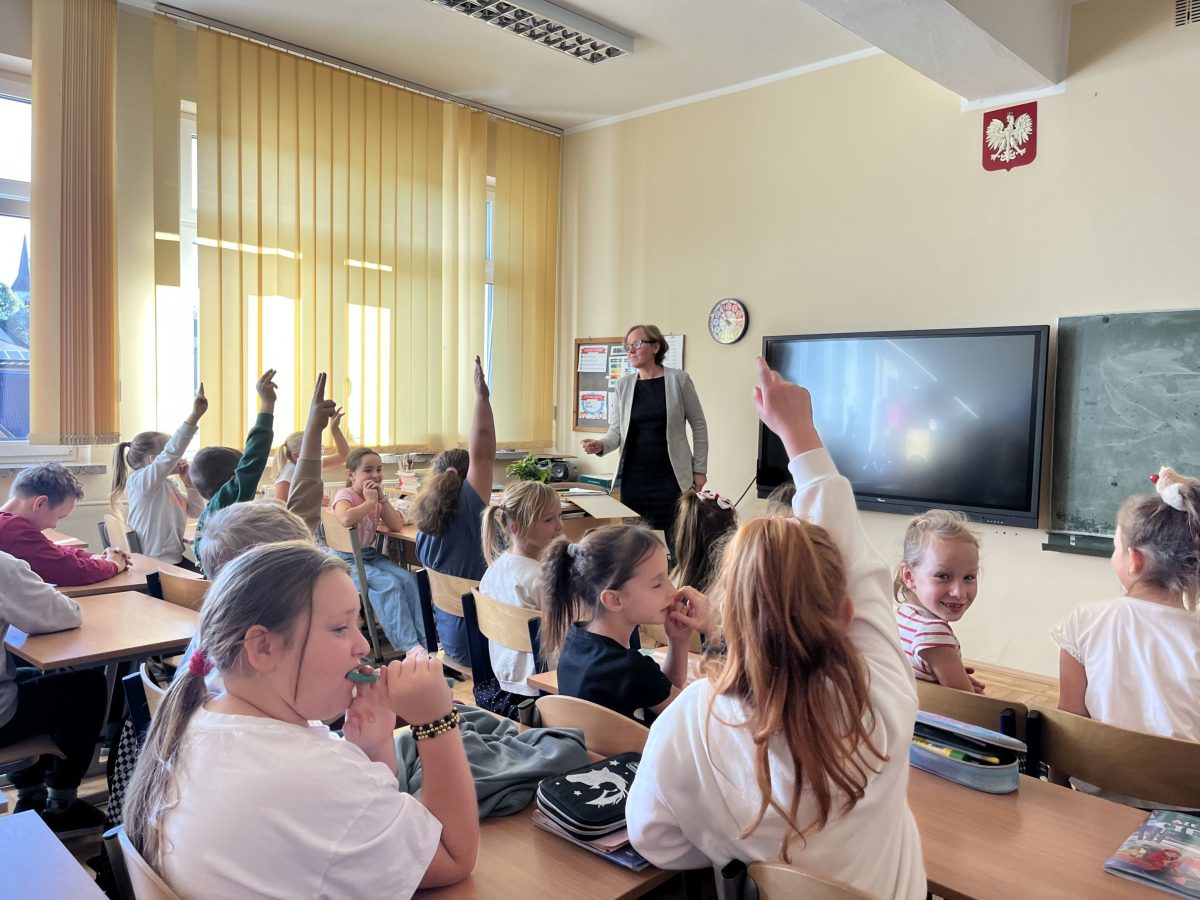 Tym razem uczniowie pracowali w parach, wspierając się nawzajem i wspólnie szukając najlepszych rozwiązań. Dodatkowo, powtarzali tabliczkę mnożenia w formie sportowej konkurencji – rywalizacja sprawiła im dużo radości, a nauka połączona z ruchem okazała się doskonałym pomysłem.
